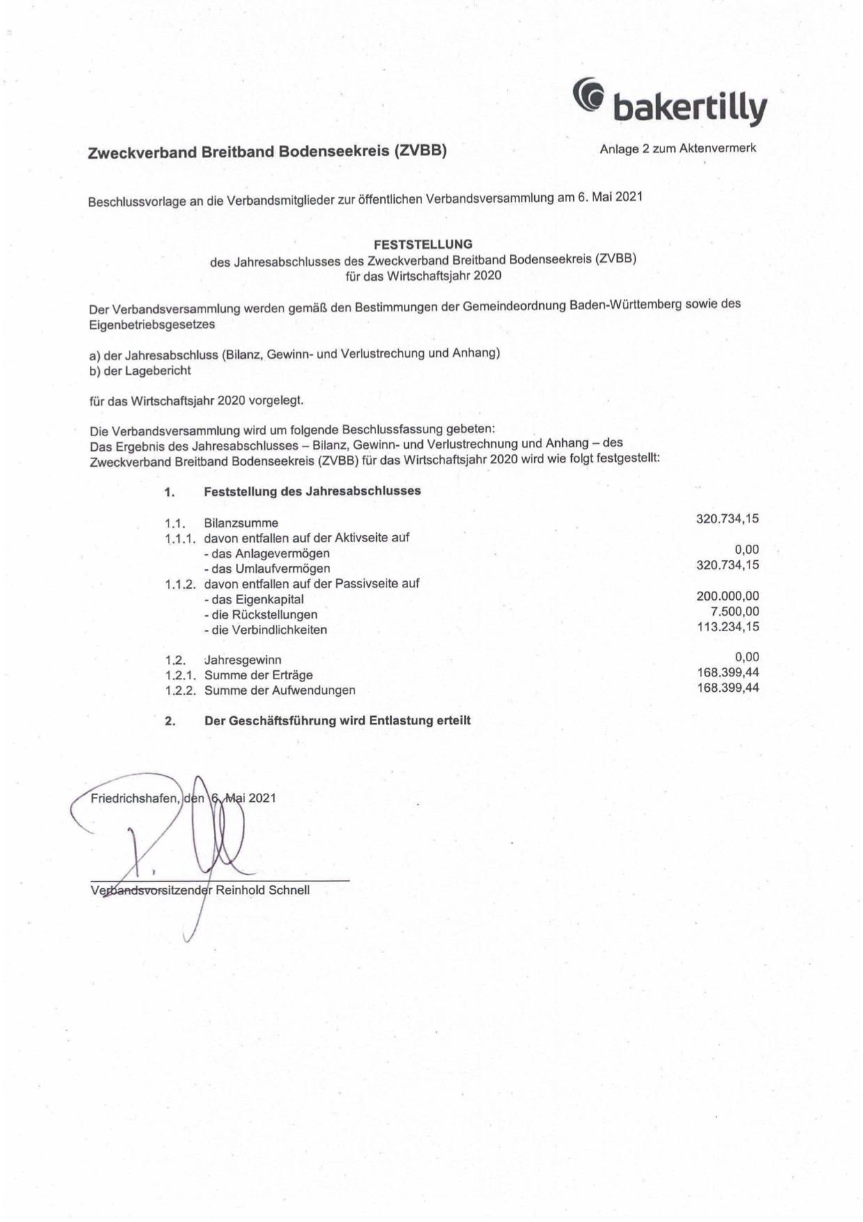In der öffentlichen Sitzung der Verbandsversammlung am 06.05.2021 wurde das Ergebnis des Jahresabschlusses – Bilanz, Gewinn- und Verlustrechnung und Anhang – des Zweckverband Breitband Bodenseekreis (ZVBB) für das Wirtschaftsjahr 2020 festgestellt und dem Verbandsvorsitzenden sowie dem Geschäftsführer Entlastung erteilt.