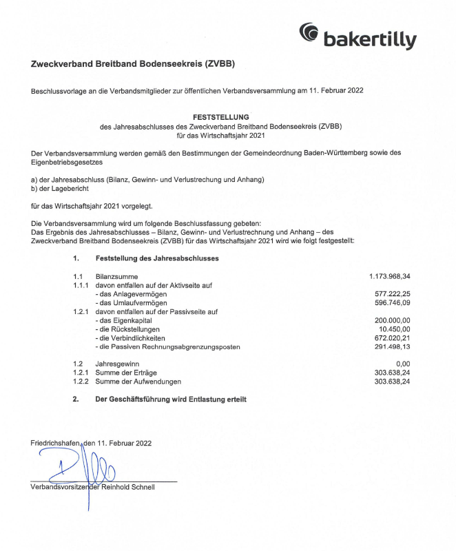 In der öffentlichen Sitzung der Verbandsversammlung am 11.02.2022 wurde das Ergebnis des Jahresabschlusses – Bilanz, Gewinn- und Verlustrechnung und Anhang – des Zweckverband Breitband Bodenseekreis (ZVBB) für das Wirtschaftsjahr 2021 festgestellt und dem Verbandsvorsitzenden sowie dem Geschäftsführer Entlastung erteilt.