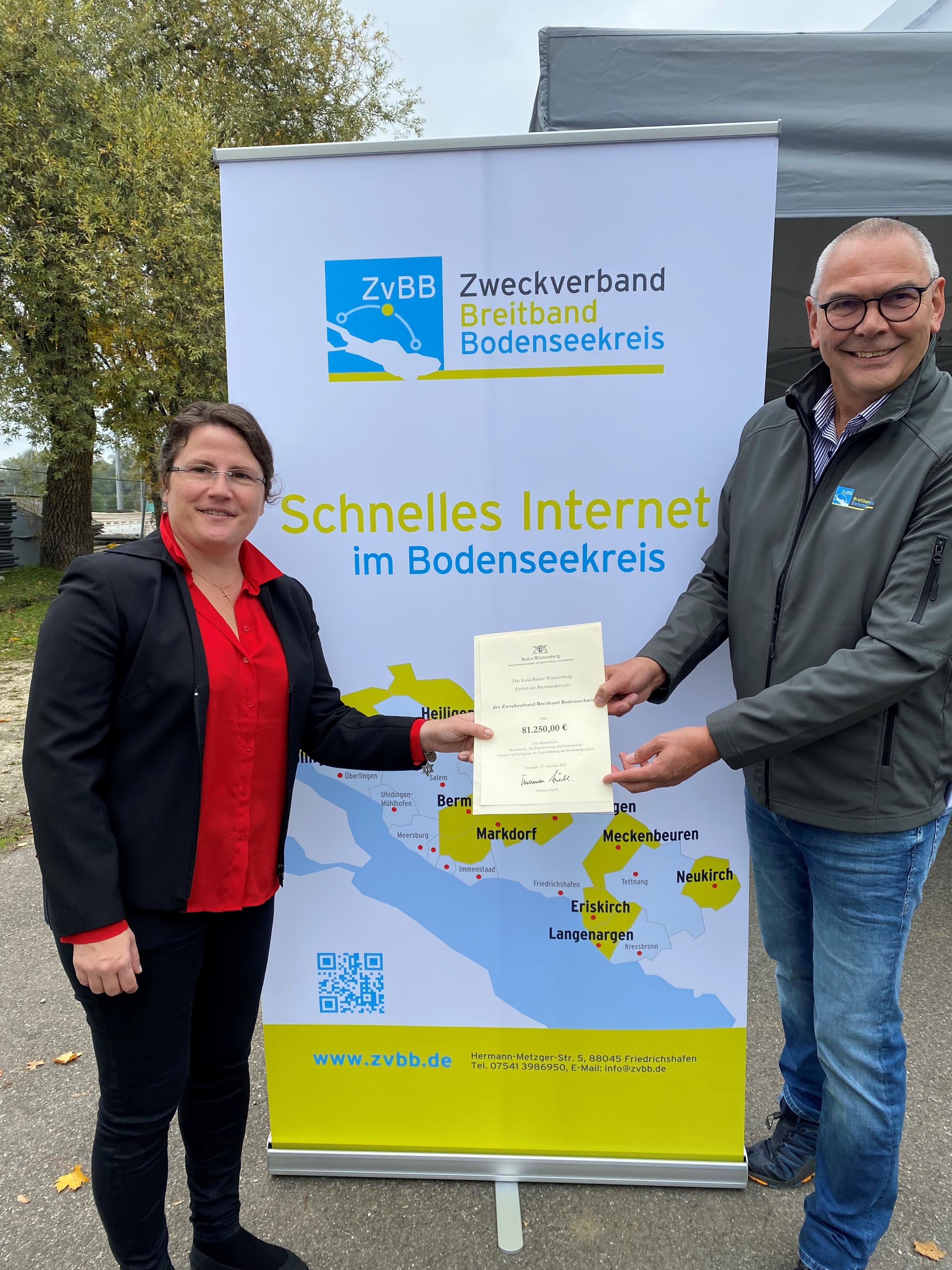 Im Rahmen eines Spatenstichs im Ausbaugebiet Bermatingen überbrachte Frau Katharina Manthey vom Innenministerium Baden-Württemberg dem Geschäftsführer Bernhard Schultes vom Zweckverband Breitband Bodenseekreis am 12. Oktober 2022 einen Zuwendungsbescheid in Höhe von 81.250,00 Euro für eine Baumaßnahme in Ahausen-Buggensegel, einen Abschnitt des Landkreisweiten Backbones.