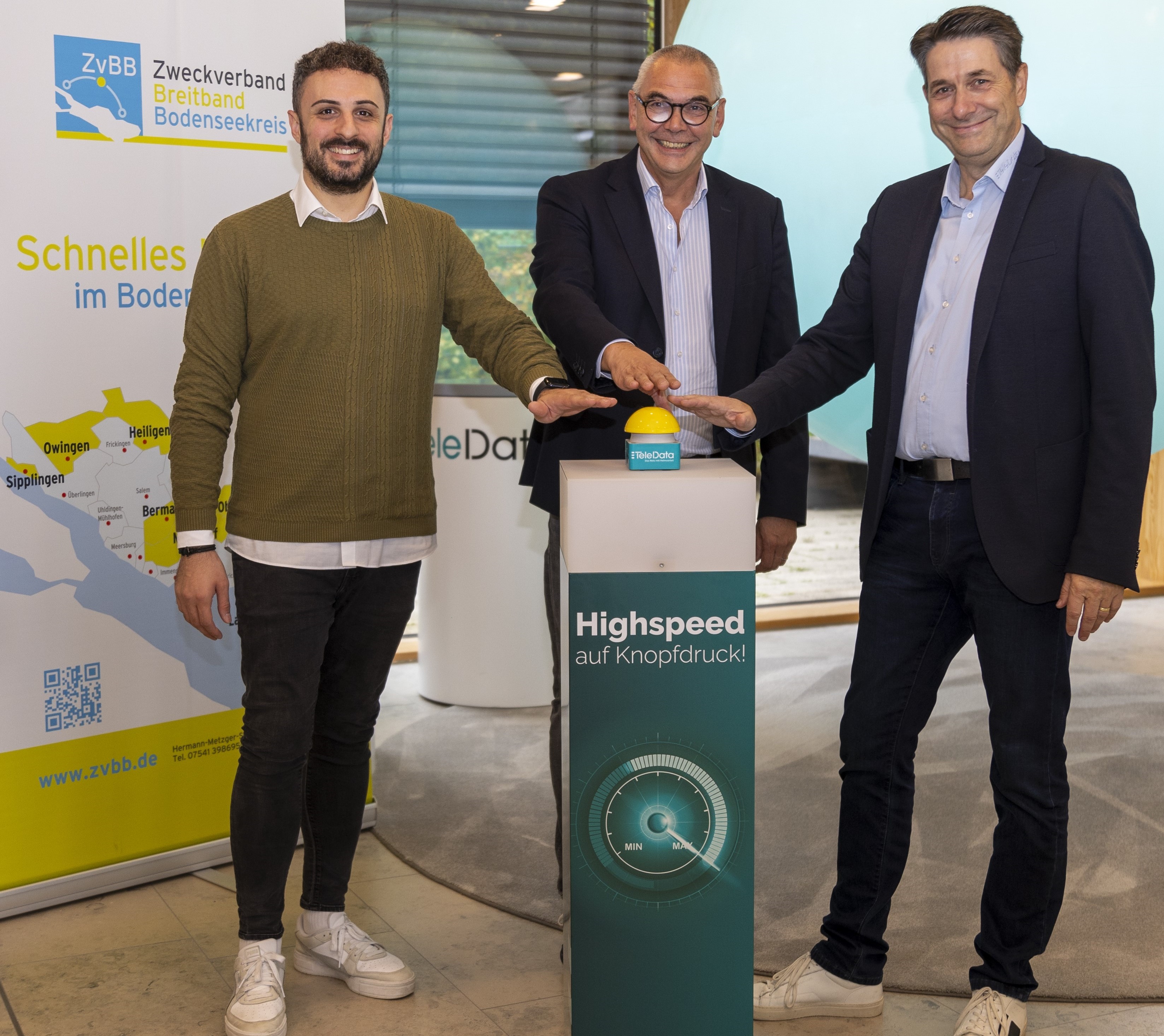 Freudig drücken die Projektbeteiligten den symbolischen Inbetriebnahme-Buzzer. Von links nach rechts: TeleData Vertriebsmitarbeiter Pino Pentrelli, ZVBB-Geschäftsführer Bernhard Schultes und kfm. Geschäftsführer TeleData GmbH, Armin Walter.