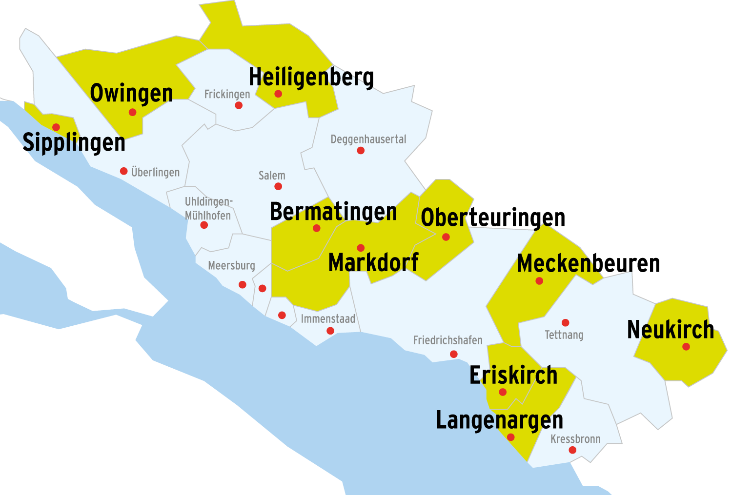 Bermatingen, Eriskirch, Heiligenberg, Langenargen, Markdorf, Meckenbeuren, Neukirch, Oberteuringen, Owingen und Sipplingen